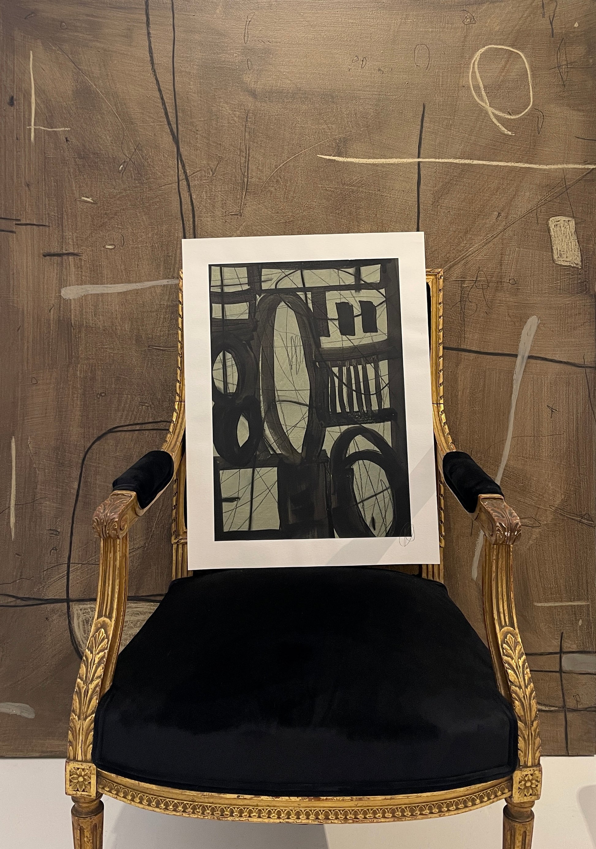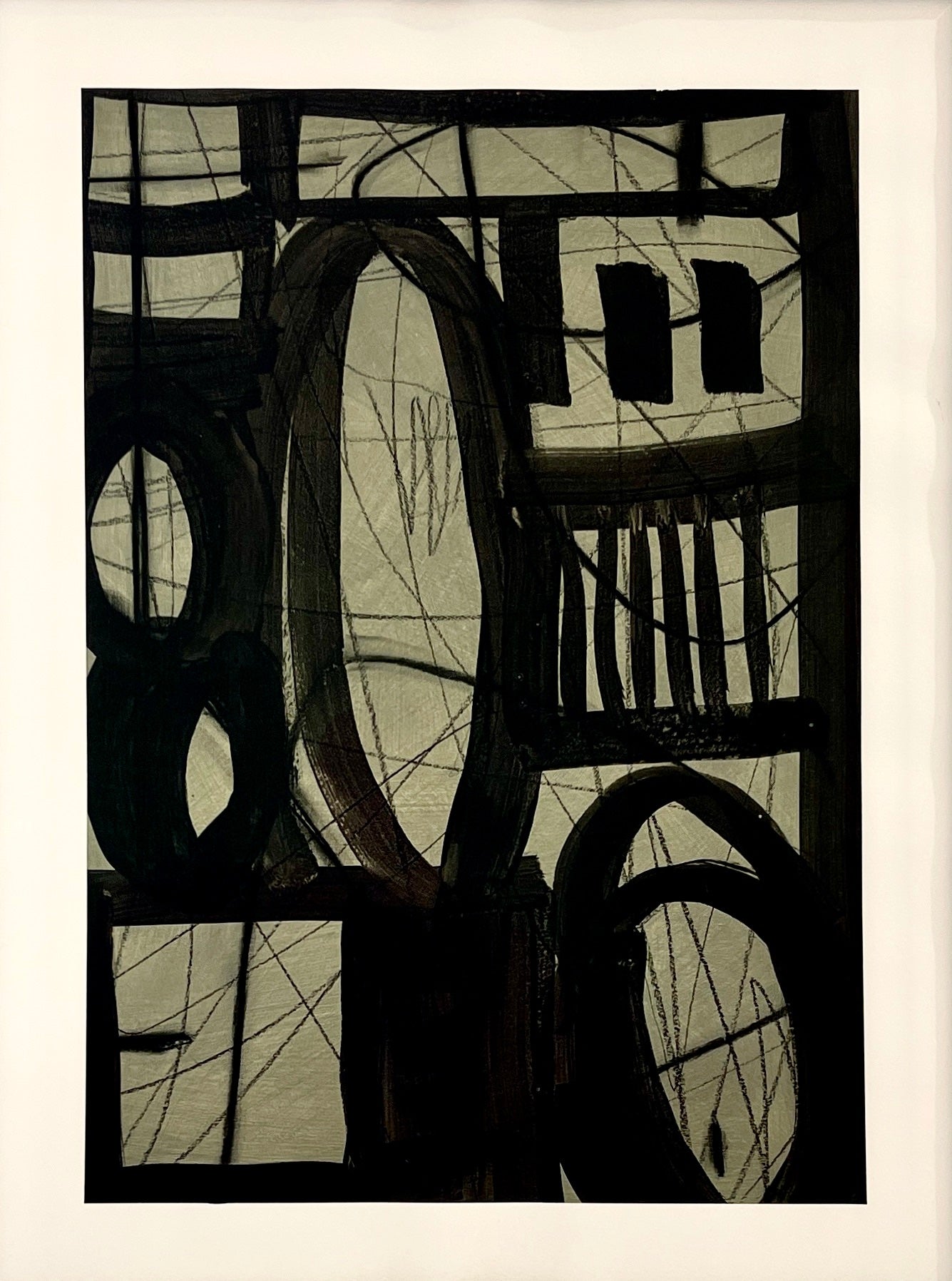 Untitled AP-123is an expressive mixed-media work on paper by Toronto artist Murray Duncan, measuring 18 x 24 inches. In this composition, Duncan builds a dynamic interplay of bold black forms, gestural strokes, and layered tonal washes. The result is a richly textured abstraction that suggests shifting architectural structures, pathways, and intersecting planes. Using a combination of acrylic, ink, and pencil, Duncan creates a sense of both movement and weight. Dense vertical marks contrast with fluid curves, while translucent overlays introduce depth and spatial ambiguity. The monochromatic palette heightens the graphic quality of the work, emphasizing the tension between structure and spontaneity — a recurring theme in Duncan’s practice. Part of the artist’s ongoing series exploring memory, construction, and the fragmentation of form, Untitled AP-123 stands alone as a visually compelling and emotionally resonant piece.