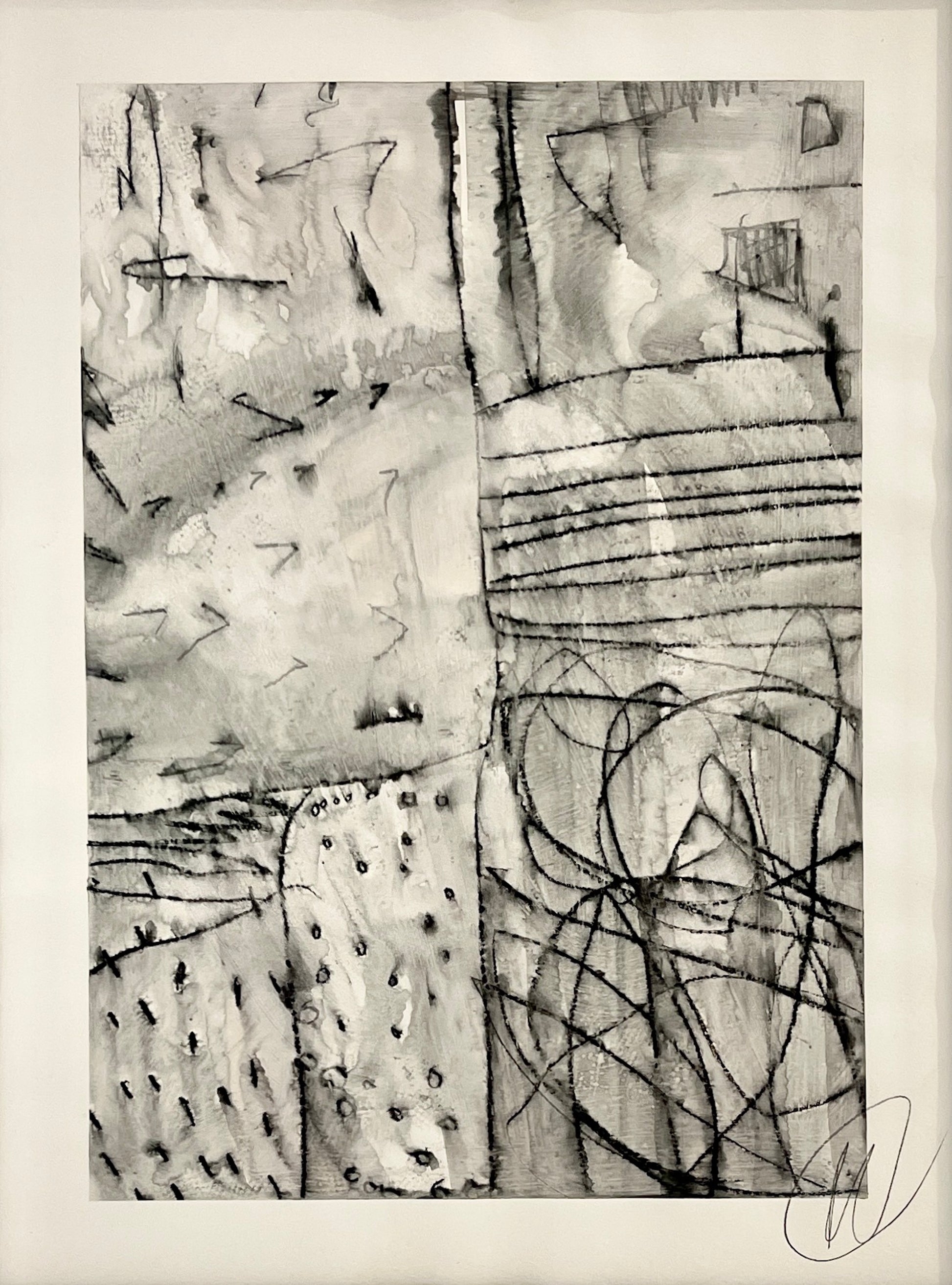 Untitled AP-124 is an expressive mixed-media work on paper by Toronto artist Murray Duncan, measuring 18 x 24 inches. In this composition, Duncan builds a dynamic interplay of bold black forms, gestural strokes, and layered tonal washes. The result is a richly textured abstraction that suggests shifting architectural structures, pathways, and intersecting planes. Using a combination of acrylic, ink, and pencil, Duncan creates a sense of both movement and weight. Dense vertical marks contrast with fluid curves, while translucent overlays introduce depth and spatial ambiguity. The monochromatic palette heightens the graphic quality of the work, emphasizing the tension between structure and spontaneity — a recurring theme in Duncan’s practice. Part of the artist’s ongoing series exploring memory, construction, and the fragmentation of form, Untitled AP-124 stands alone as a visually compelling and emotionally resonant piece.